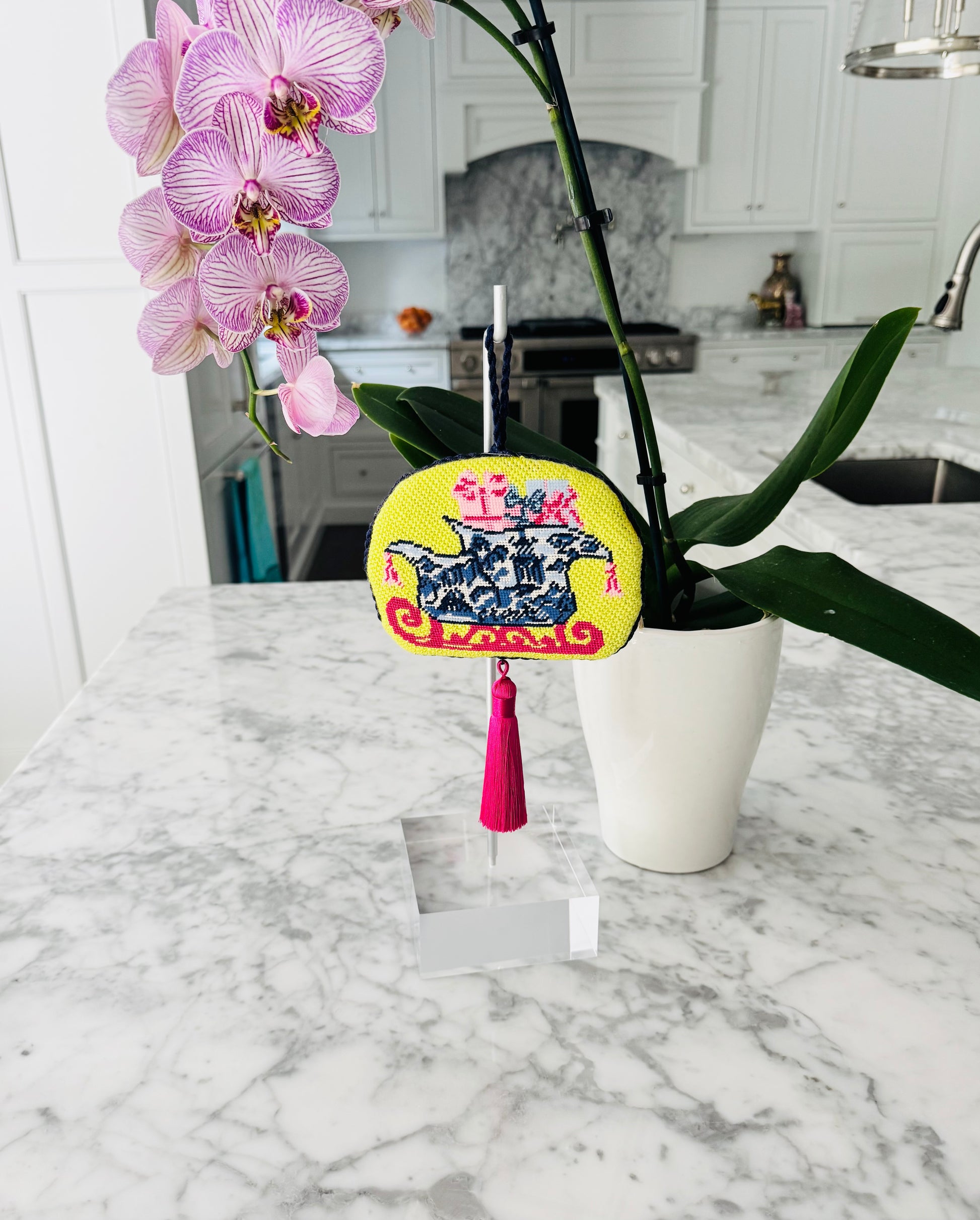 Elevate your needlepoint display with this modern, one of a kind acrylic stand. Designed with clean lines and a minimalist silhouette, this stand offers a sleek contemporary way to showcase your needlepoint pieces year round with any decor.
